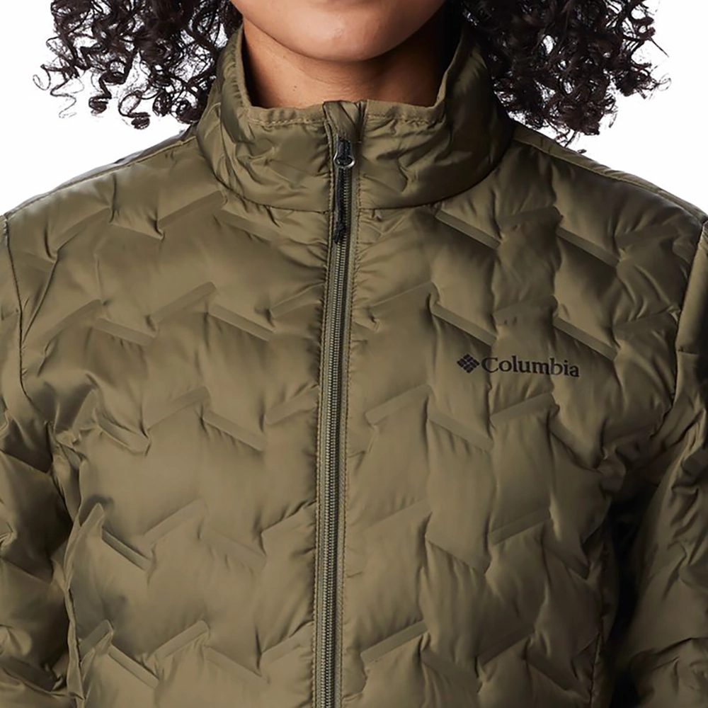 A jaqueta down feminina preta Delta Ridge™ possui 650 fill down, plumas com certificado RDS* que assegura o bem-estar animal. Esse tipo de isolamento térmico é composto por plumas de alta qualidade distribuídas que mantém um excelente conforto térmico enquanto garante maior sensação de leveza em uma jaqueta compacta.